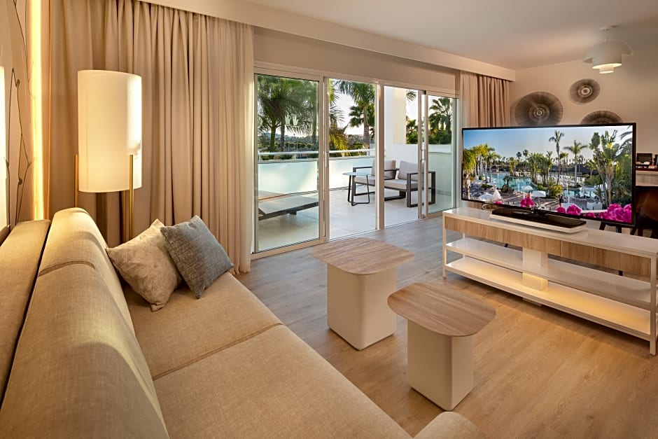 SUITE PRESTIGE 2 ADULTS is 700 square feet and includes 2 single beds 80-130 width plus living room, balcony, satellite tv , hairdryer, safe, bathrobes, and slippers.